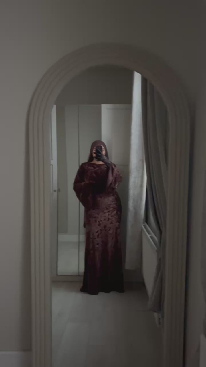 A timeless full-length black dress crafted from subtly textured fabric for an elegant, refined look. Designed with flowing sleeves and a flattering silhouette, it offers both comfort and sophistication. Perfect for formal occasions, evening wear, or effortless elevated styling.