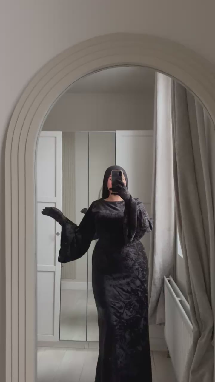 A timeless full-length black dress crafted from subtly textured fabric for an elegant, refined look. Designed with flowing sleeves and a flattering silhouette, it offers both comfort and sophistication. Perfect for formal occasions, evening wear, or effortless elevated styling.
